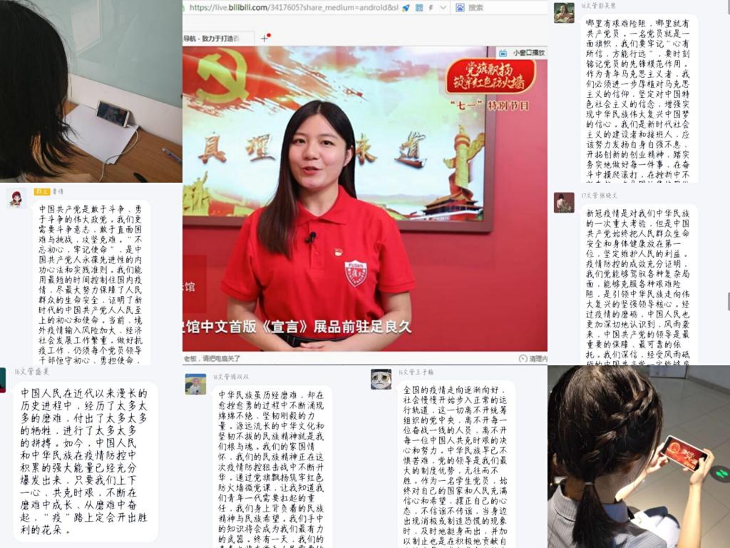 2020年7月1日上午9点,高校党组织战“疫”示范微党课“七一”专题(第3讲)通过光明网、新华网、微言教育等媒体平台首播,为庆祝中国共产党成立99周年,弘扬抗疫精神,激发青年党员责任担当,文化产业管理学生党支部依托微党课资源,开展七月份线上主题党日活动。活动由支部书记王龙龙发起,支部全体党员以直播和回看两种形式观看了示范微党课。