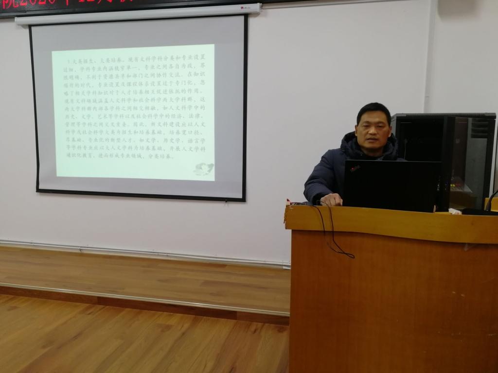 张德岁做了新文科建设思考的专题党课,从新文科的内涵、建设特征、建设的学理基础、建设路径及我校新文科专业建设的实践与探索等方面讲解,并表示学院会根据时代发展需求,将学院各学科、专业、课程相互融合,为将学生培养成为具有人文情怀素养的合格应用型人才而努力探索。