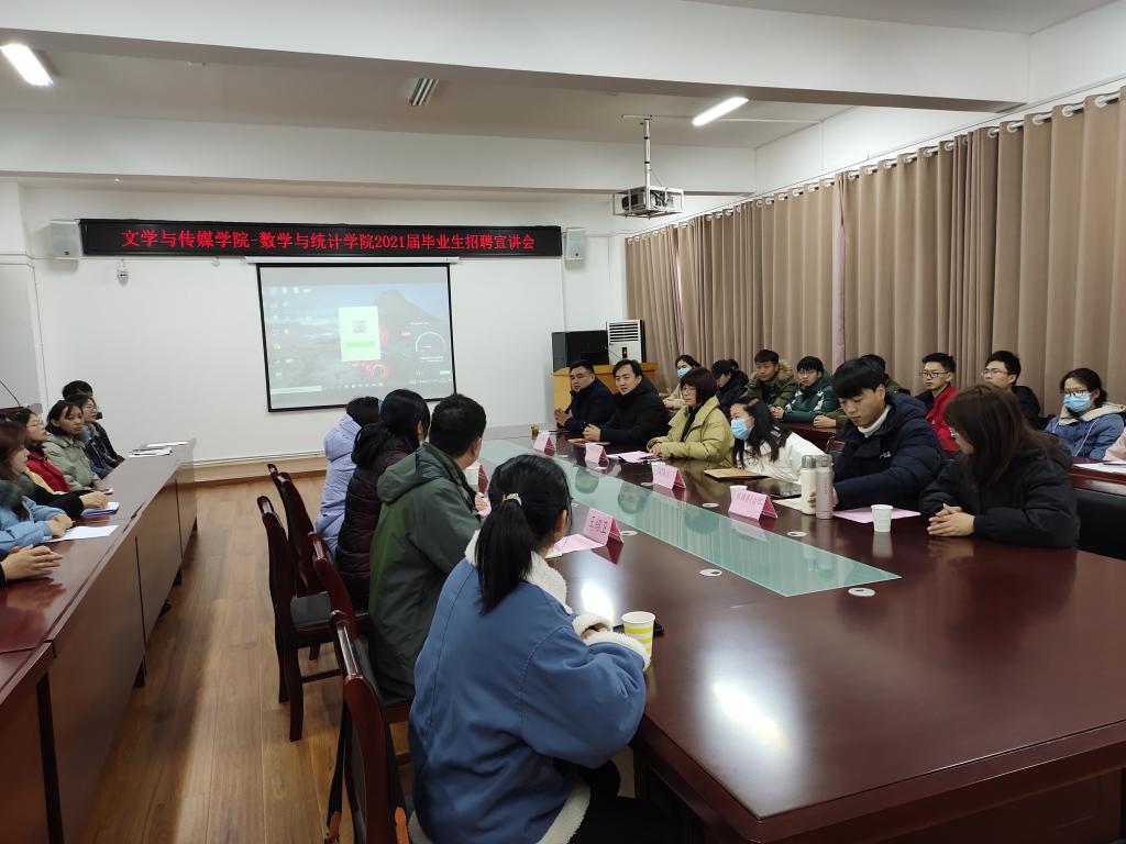 为做好毕业生就业指导服务工作,推进2021届毕业生顺利就业。同时也为学生提供更好的实习就业平台,进一步深化校企合作。2020年12月29日,文学与传媒学院和数学与统计学院在东教A303联合举办2021届毕业生招聘宣讲会。文学与传媒学院党委书记李月云、副书记王绍卫、数学与统计学院党务秘书徐依俭、团总支书记刘静出席会议。两院2017级和2018级部分学生参会。参与企业宣讲的企业有南京勤善堂健康产业集团、合肥跟谁学互联网教育科技公司、TATA木门以及合肥猿辅导互联网教育科技公司。本次招聘宣讲会开场式由李月云主持。