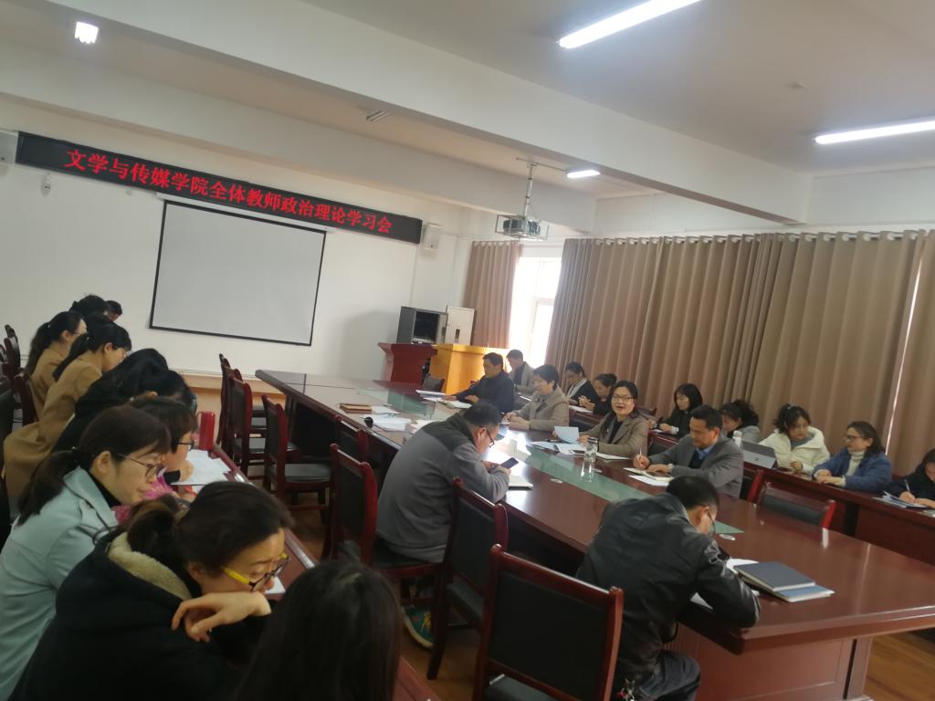 3月24日,文学与传媒学院召开全体教师政治理论学习会,党委书记李月云、院长蒋宗霞、副书记王绍卫、副院长张德岁及全体教师参会,会议由李月云主持。