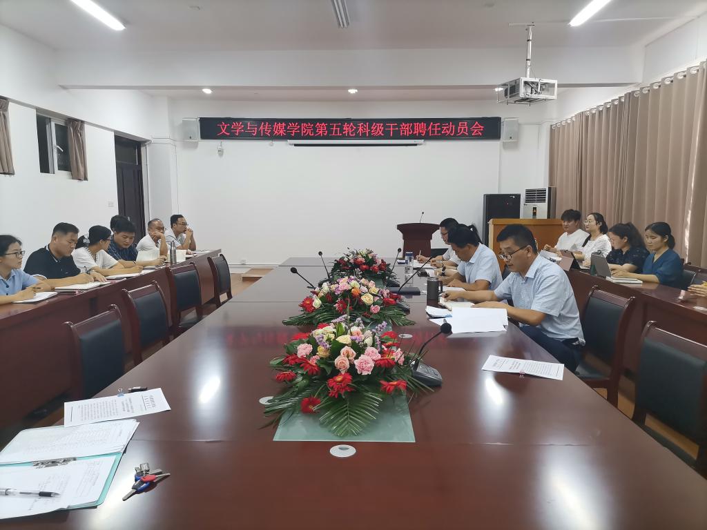 9月15日下午,文学与传媒学院在303会议室召开第五轮科级干部聘任动员会,会议由学院党委书记杨文艺主持,学院党政班子成员、全体教职工参加了会议。
