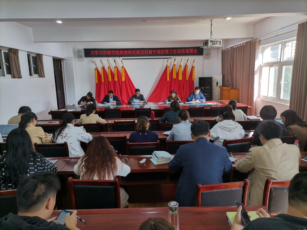 为进一步大力弘扬高尚师德,引导广大教师加强师德修养,践行师德规范。10月13日下午,文学与传媒学院召开师德师风建设问题专项治理工作部署会,会议由学院党委书记杨文艺主持,学院党政班子成员及全体教师参加了会议。