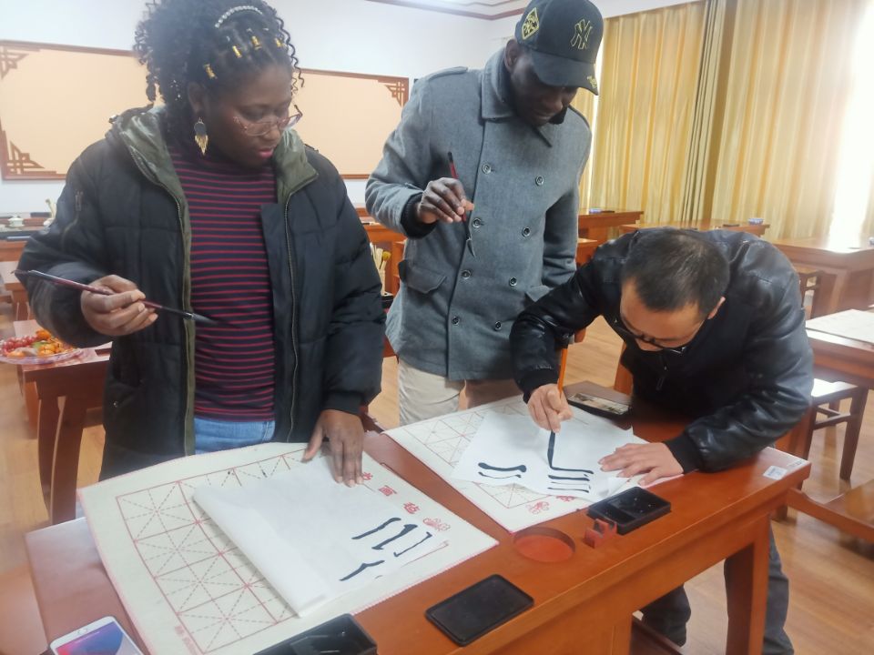 课程间隙,来自加纳的李安,激动地谈到,“我特别喜欢中国的书法作品,我也收藏了很多的书法作品呢!今天能够跟着张老师学习书法,感觉太棒了,我觉得这一次不够,应该每个月都来练一次的!”他的妻子媞娜,也向我们分享了她与丈夫初来中国,在两年左右时间里通过不断看剧和口语练习等途径自学汉语口语的经历,并且向我们强调了“坚持和不放弃”的重要性。张良斌老师特别书写了“前程似锦”和“萬事如意”两份作品送给李安夫妇,以表祝愿。李安夫妇向张良斌老师表达了深深感谢,他们计划将书法贴在房间里,并且勤加练习书法,练好中国书法。