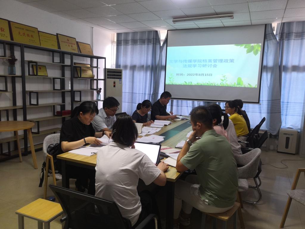 8月15日,文学与传媒学院在党团活动室召开档案管理政策法规学习研讨会,学院党政班子成员及科级干部参加学习会,会议由副院长李娟主持。