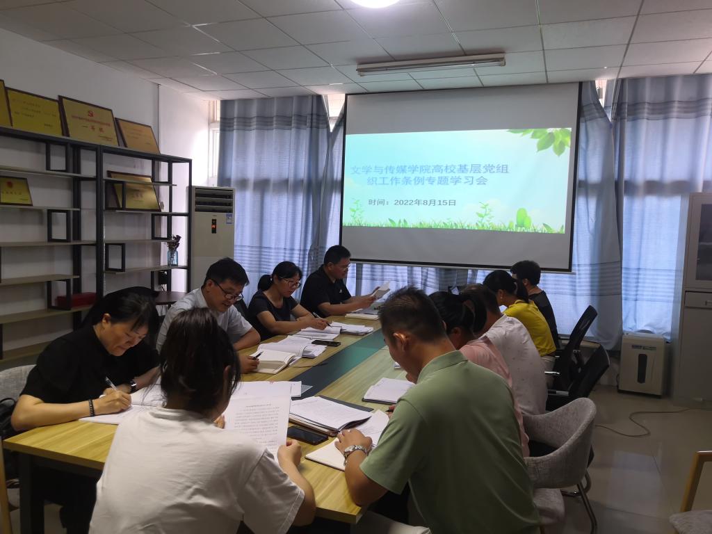 8月15日,文学与传媒学院在党团活动室召开高校基层党组织工作条例专题学习会,学院党政班子成员及科级干部参加学习会,会议由副院长满建主持。