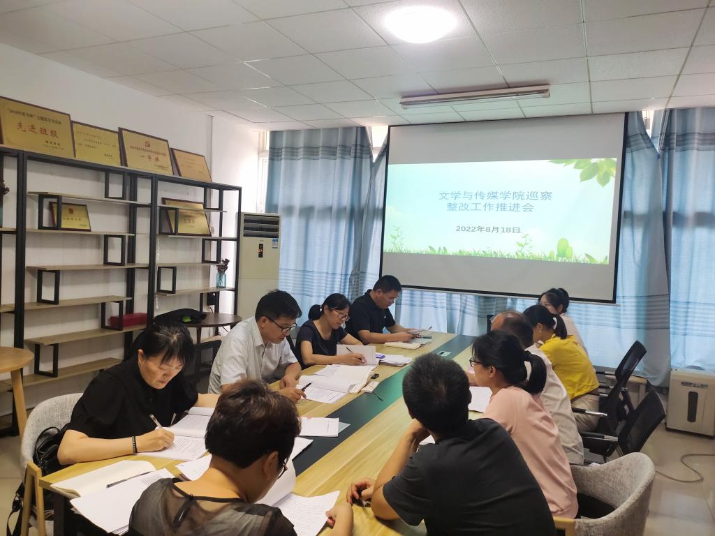 为进一步做实巡察“后半篇文章”,扎实推进整改工作,8月18日,文学与传媒学院在党团活动室召开巡察整改工作推进会,学院党政班子成员及科级干部参加推进会,会议由学院党委书记杨文艺主持。