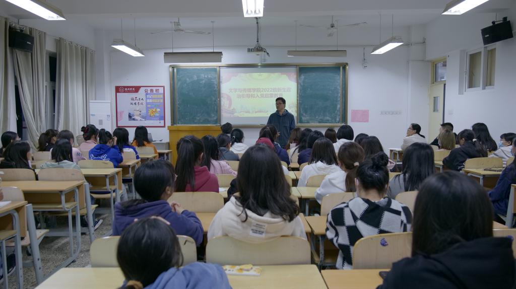 为加强2022级新生思想政治引领、引导新生积极向党组织靠拢,自觉争做新时代中国特色社会主义的坚定信仰者和忠实实践者,10月12日,文学与传媒学院在东教A412开展了2022级新生入党启蒙教育。学院党委书记杨文艺主讲,分团委书记王磊主持。新闻学学生党支部书记李雪玲及2022级全体新生参加了活动。