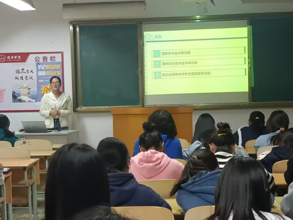 辅导员李雪玲老师通过主题班会、谈心谈话等各种形式宣讲了大学生助学贷款、国家励志奖学金、国家助学金、勤工助学学费减免、校内助学金、临时困难补助等不同资助政策的申请流程、评审程序、资助发放操作办法等。