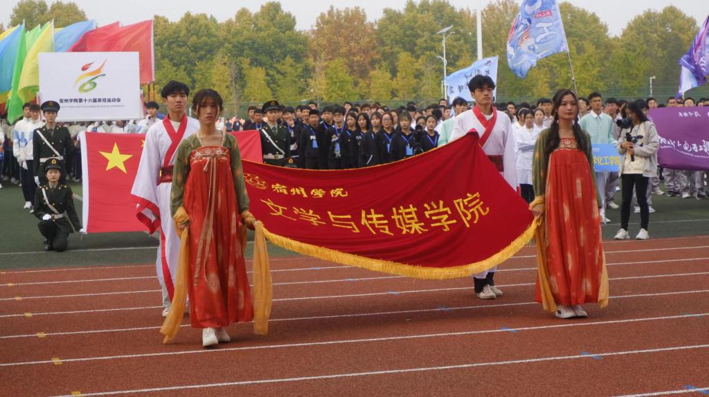 为展现当代大学生的青春风采,激发大学生参与体育运动的活力,20221027日上午8时,文学与传媒学院参加宿州学院第十六届田径运动会开幕式。