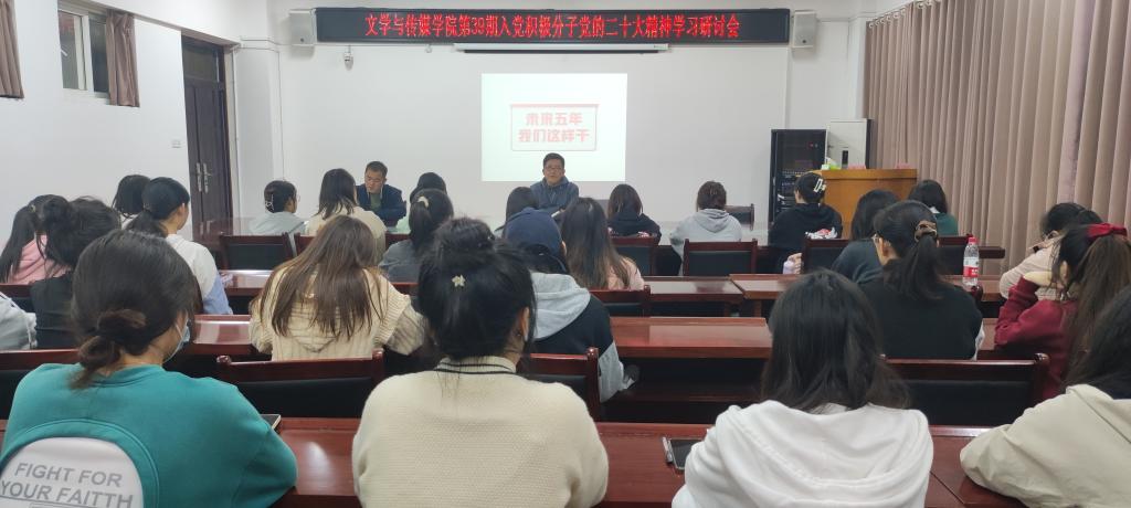 为深入学习宣传贯彻党的二十大精神,按照学校关于举办第39期入党积极分子培训班的通知要求和文学与传媒学院校园文化品牌建设关于学习宣传贯彻党的二十大精神方案要求,11月1日晚,文学与传媒学院组织第39期入党积极分子在教A303室召开党的二十大精神学习研讨会。文学与传媒学院党委书记杨文艺及本期培训班学员参加研讨会,研讨会由文化产业管理学生支部书记王龙龙主持。