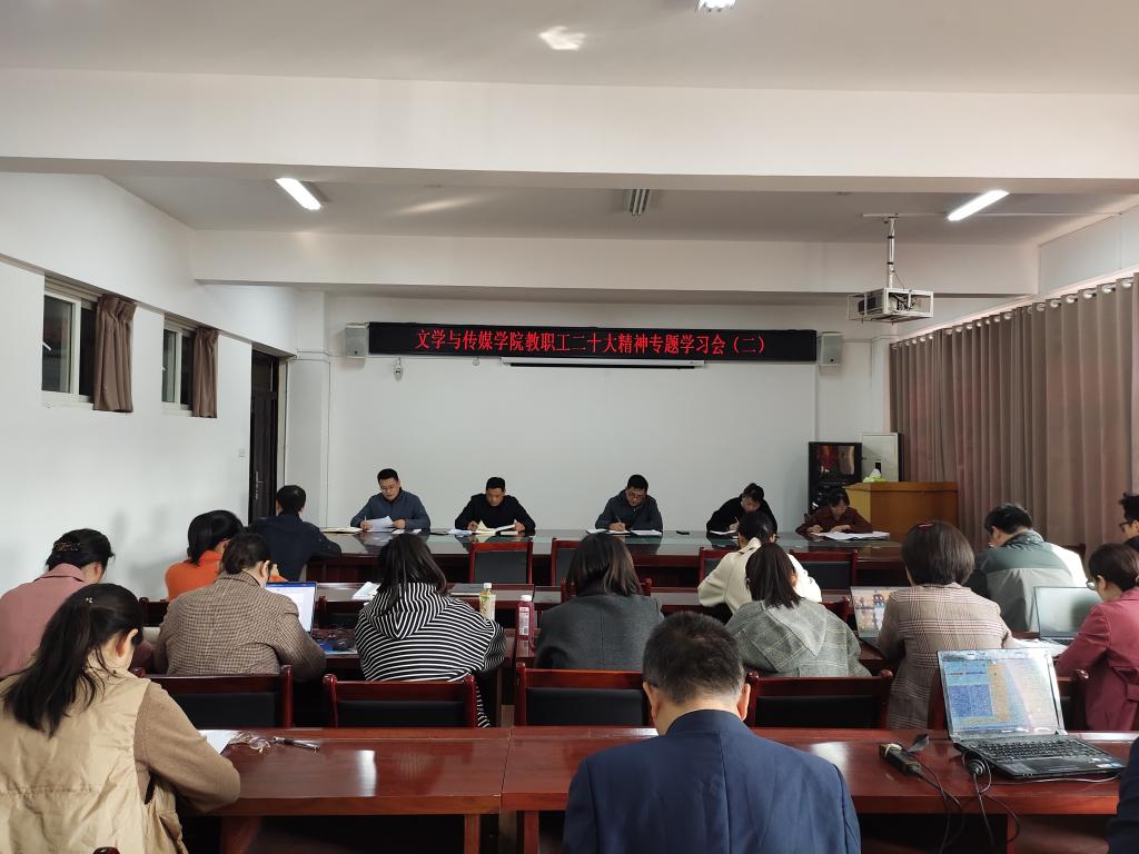 11月2日下午,文学与传媒学院在教A303召开全体教职工理论学习会,组织全体教职工第二次专题学习党的二十大精神。学院领导班子及全体教职工参加学习会,学习会由学院党委书记杨文艺主持。