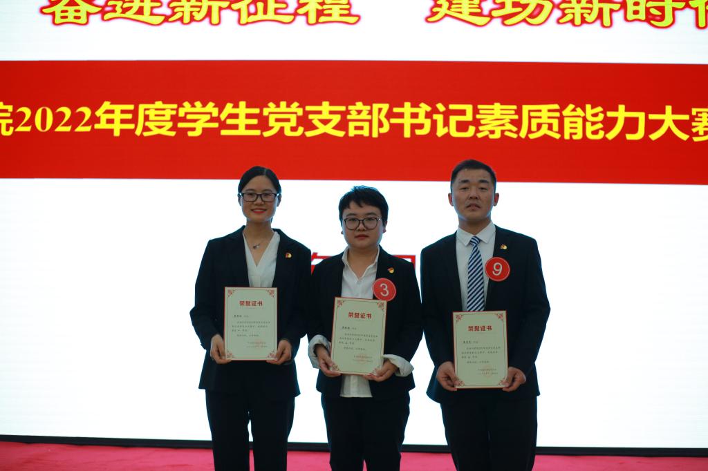文学与传媒学院三名学生党支部书记在经过基础知识测试、典型案例分析等初赛环节后,顺利进入决赛,在必答题环节,来自文学与传媒学院的三位老师对答如流。在激烈的抢答题环节李雪玲老师多次按下抢答器并正确作答,最终在此环节以九十分的成绩位列全场最高分。经过激烈角逐,李雪玲、王龙龙、吴琼瑶分别获得了一等奖、二等奖、三等奖的好成绩。本次比赛,文学与传媒学院三名参赛的学生党支部书记结合工作实践,表现出了较强的综合素质。