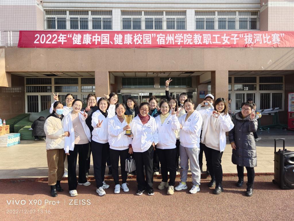 为贯彻落实党的二十大精神培养团队协作精神,加强学院教职工沟通交流,增进教职工之间的友谊,提升教职工的身心健康,丰富教职工文体生活,127日中午12点半,文学与传媒学院在宿州学院2022健康中国、健康校园教职工女子拔河比赛喜获季军。