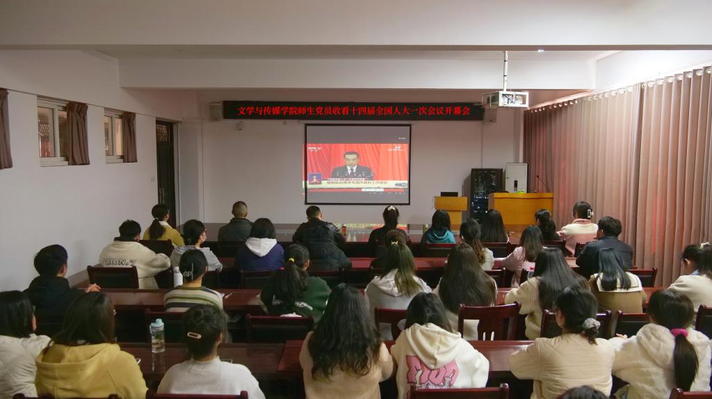 3月5日上午,十四届全国人大一次会议在京开幕,文学与传媒学院组织师生党员代表在303室集中观看了十四届全国人大一次会议开幕会。