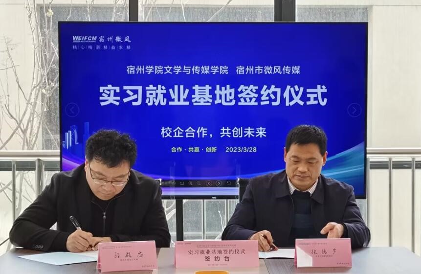 为深入学习贯彻党的二十大精神,落实宿州市“4510”校地联合科创行动,进一步加强校企、校地合作、推进产业学院建设、推动高水平大学建设。3月28日上午,文学与传媒学院院长张德岁、副院长李娟、党委副书记刘影等一行赴宿州微风传媒公司开展校企对接和实习就业基地签约挂牌仪式。