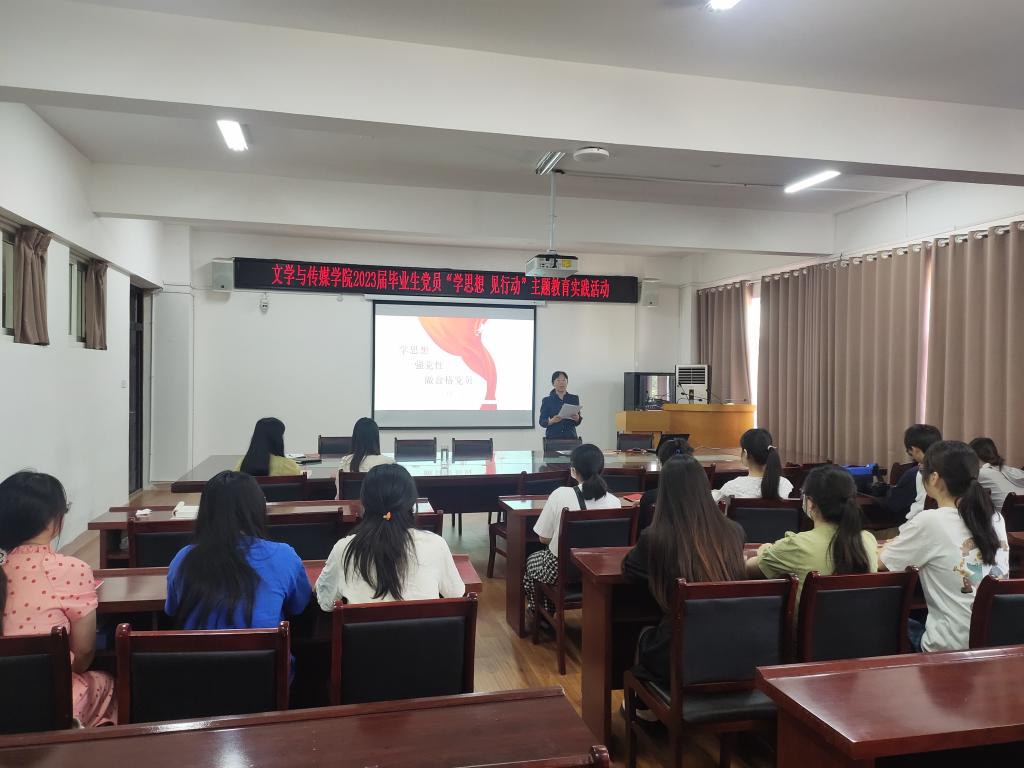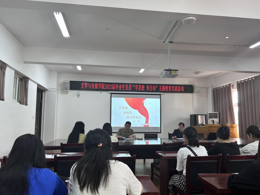 为持续加强基层党组织建设,结合学习贯彻习近平新时代中国特色社会主义思想主题教育,5月17日上午,文传学院在教A303会议室组织毕业生党员开展“学思想 见行动”主题教育实践活动。学院党委副书记、纪委书记刘影,毕业班辅导员、学生党支部书记王龙龙参加活动。