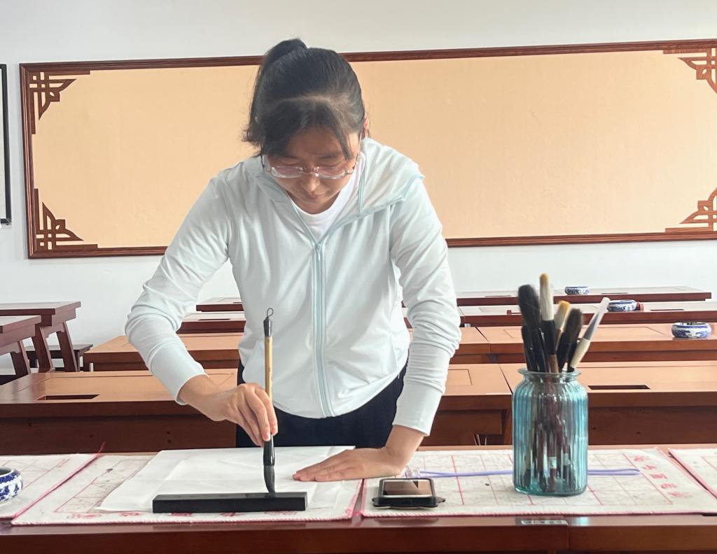 在书法实训室,应老师和同学们的强烈要求,冯倩提笔挥墨,书写宿州学院的校训,一笔笔铿锵有力,又如曼卿之笔,颜筋柳骨。她一边书写一边与师生交流心得,解释着一笔一划之间的书写道理,同时也将书法所蕴含的人生哲理道尽。