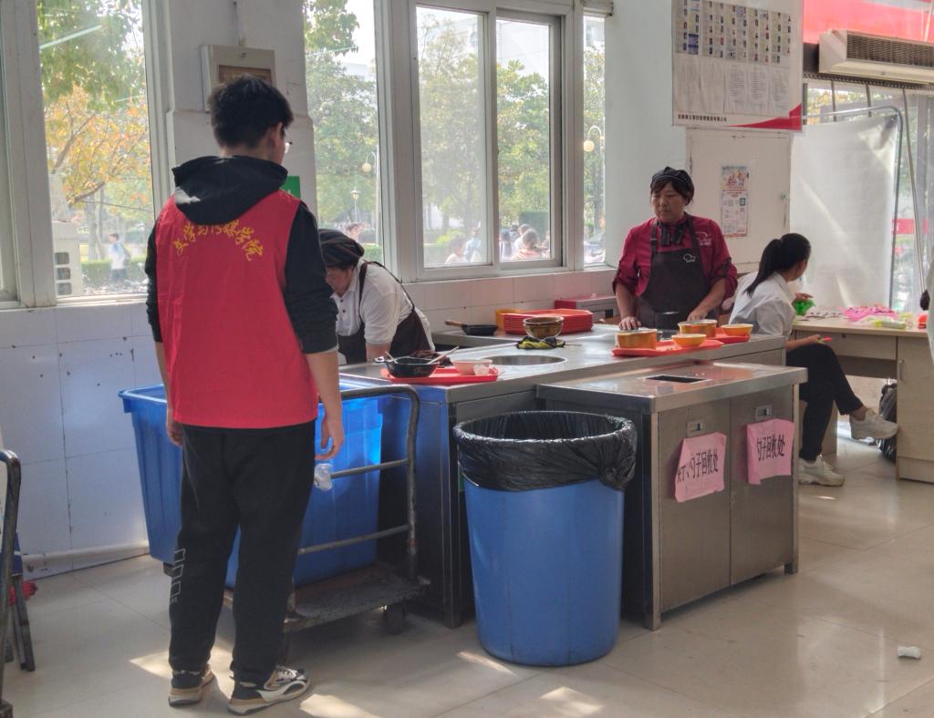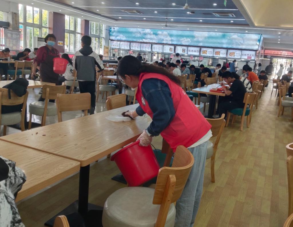 活动中,各负责人首先和食堂经理对接,并对其进行了明确的分工:摆放桌椅,清洁桌面,扫地。无论是将桌椅摆放整齐,还是清理桌面的食物残渣,亦或是扫地,入党积极分子们都抱着为食堂员工减少工作量的心态,践行志愿服务精神,锤炼服务品质。大家通力合作配合,活动圆满落幕。
