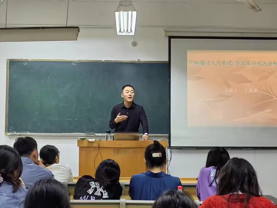 王龙龙老师就如何严格履行入党手续,争取早日成为合格党员为题开讲,以《中国共产党发展党员工作细则》为依托,对党员发展流程和同学们自觉接受党组织的教育、培养、考察途径做了详细阐释,并勉励同学们在服务中锤炼品质,以实际行动完成入党心愿。