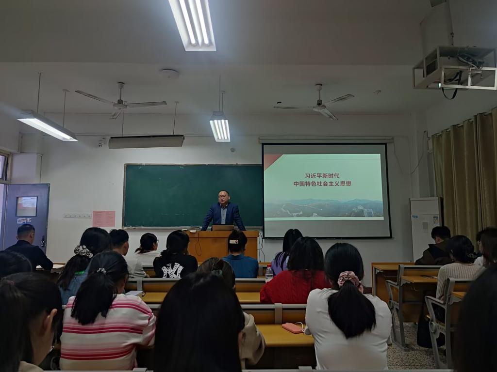 学院党委书记王金岭以“习近平新时代中国特色社会主义思想的基本问题”为题,从思想创立的时代背景、“两个结合”的重大成果、完整的科学体系、历史地位等方面对习近平新时代中国特色社会主义思想进行了阐释解读,并勉励青年学生知理论之理,悟理论之用,切实加强理论武装,更好发挥理论指导学习实践的作用。