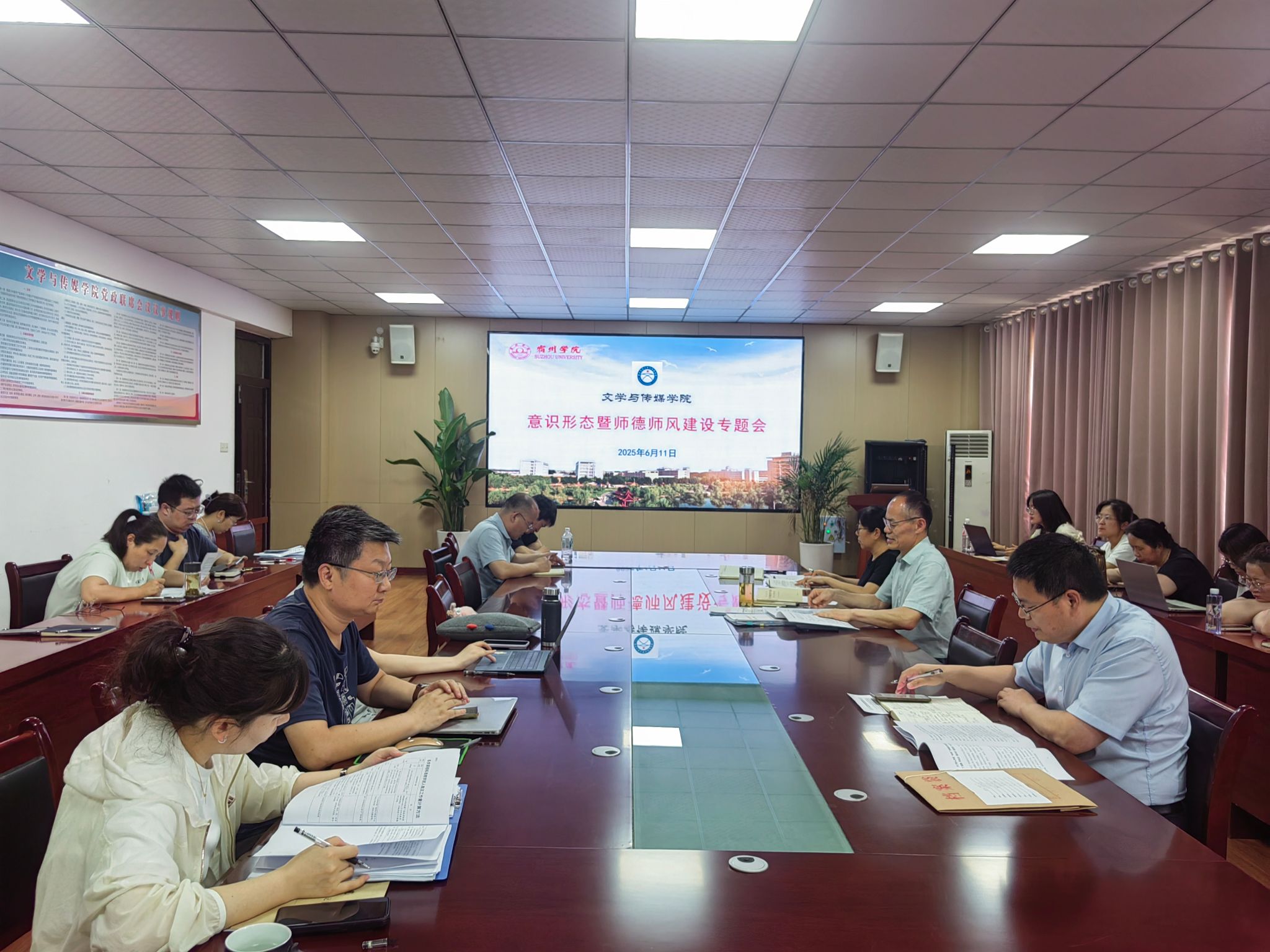 6月11日下午,文学与传媒学院在教学楼A303会议室召开了意识形态暨师德师风建设专题会,党委书记郝景东主持,学院全体教职工参加会议。