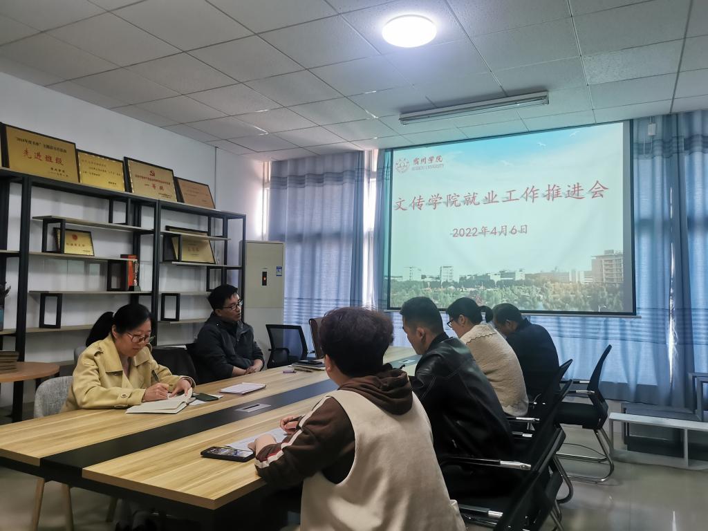 毕业班辅导员分别汇报了目前各班级的考研和就业情况,学生事务管理科科长吴琼瑶汇报了网络就业招聘会的前期准备情况,文学与传媒学院在四月份准备举办两场专场招聘会,并就网络招聘会开展的具体情况进行了说明。