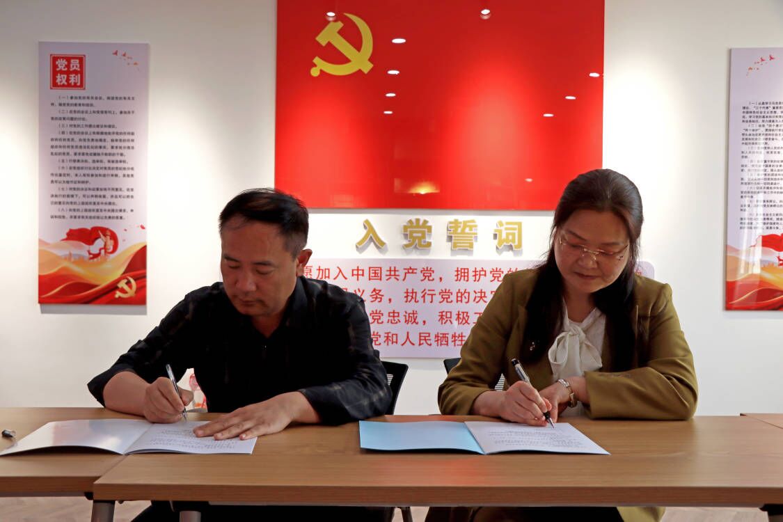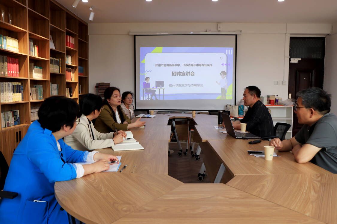 李月云向用人单位介绍我院2024届毕业生的专业及就业情况,苏中原介绍了邳州市官湖高级中学的基本情况、地理位置、交通情况、招聘条件、资薪待遇等。双方进行了深入交流,达成实习就业基地合作共识,举行了实习就业基地签约仪式。