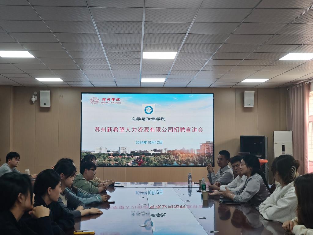 为深入贯彻高校就业优先战略,搭建校企交流平台,为毕业生的职业启蒙发展提供方向,2024年10月12日,宿州学院文学与传媒学院携手苏州新希望人力资源有限公司举办专场招聘宣讲会,文学与传媒学院院长李月云、学生事务管理科科长吴琼瑶及部分2024届毕业生参加了招聘。