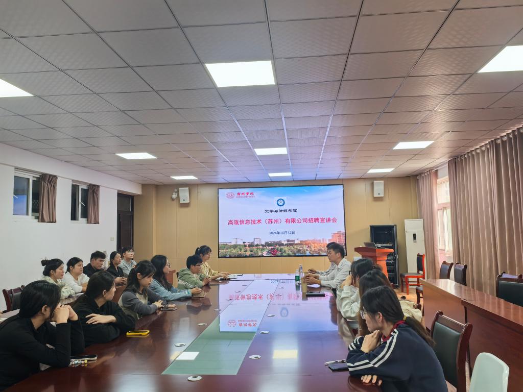 为促进校企深度合作,搭建应届毕业生高质量就业平台,实现人才供需精准对接。2024年10月12日,文学与传媒学院举办高瓴信息技术(苏州)有限公司专场招聘会,院长李月云、学生事务管理科科长吴琼瑶及部分2024届毕业生参加了招聘。