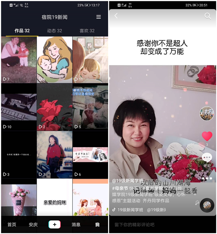 活动参与形式灵活多样,以互联网为载体展开,并通过班级抖音账号进行最终的作品展示。同学们可以对着镜头,从和父母的一张合影、一件珍贵的纪念品或是一段与父母之间意义深刻的对话为出发点,说出自己与父母的故事;还能通过朗诵诗歌、吟唱歌曲等形式抒发平时没有机会表达的情感。活动进行中,同学们积极参与,不少同学的作品制作精良、感情真挚,将一些令人动容的点滴事迹放在自己制作的视频中,展现自己与父母之间珍贵的回忆,同时也表达了自己对于亲人的珍视。活动结束后,辅导员吴琼瑶评价此次活动:“制作用心,感人至深,传承好家风,传承正能量,以亲情为动力,奋力前行”。