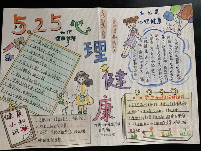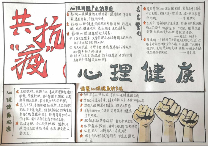为进一步加强对大学生心理健康的关注,持续做好校园疫情防控工作,加强大学生心理健康教育,文学与传媒学院承办的5.25心理健康月“齐心抗疫•聆听心韵”主题手抄报大赛于5月底至6月上旬成功举办。