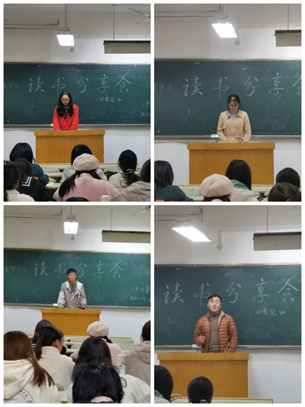 活动开始,杨进蓉简单介绍活动流程。然后共有十一名学生代表依次上台分享自己喜欢的读物以及个人的感受。首先是由汪子良同学为这次读书分享会开了一个好的头,他向同学们介绍了英国作家维罗妮卡·亨利所著的《夜莺书店》,由谈书谈到了自己,从中还提到了“书是人类灵魂的避难所”,在自己最困难的时候,希望通过书籍来解救自己,让在座的同学们深受启发,产生共鸣。接下来的每一位上台的同学都向班级同学分享了各自最喜欢的读物,或谈及人生,向同学们阐述了人生的意义和价值,或反应社会,提高同学们对社会的认知及看法……这些分享的读物中,有自传、小说,还有一些其他的体裁,对拓宽大家的知识面有很大的帮助。