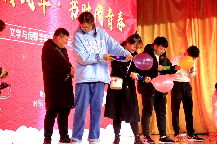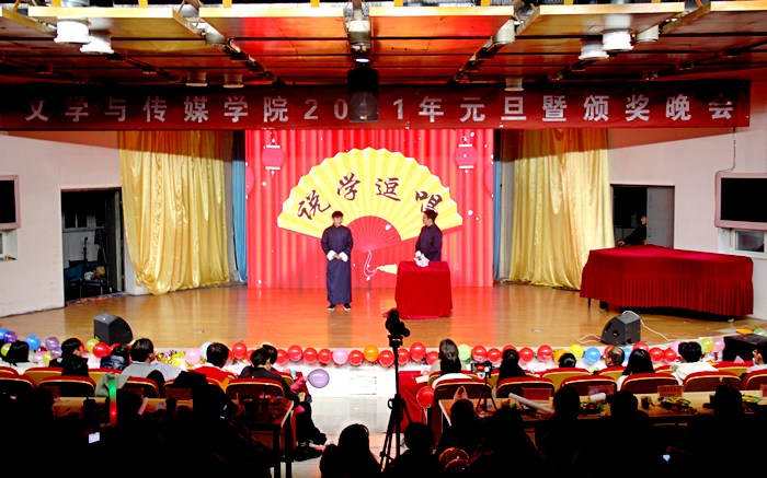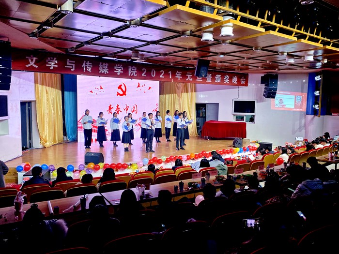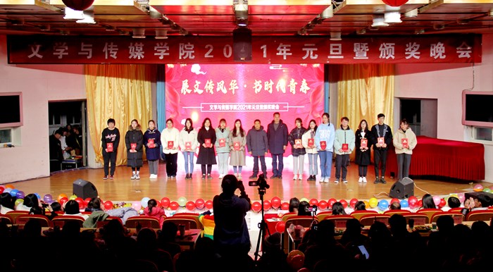 晚会以“展文传风华,书时代青春”为主题,节目流行与古典兼收,温情与火热并举,形式多样,精彩纷呈;涵盖小品相声、舞蹈、对唱合唱、朗诵、模特走秀、乐器合奏等类型节目。晚会现场,台上精彩节目轮番上演,舞台下,观众不断欢呼鼓掌,气氛热烈。对唱《世界上另一个我》以其欢乐的曲调给现场营造了轻松欢快的氛围;小品《招亲大会》《白蛇前传》和相声《众口难调》将观众引领进一个诙谐幽默的世界;中场热舞、港风舞蹈《自作多情》及歌曲串烧,激情洋溢,激起全场观众热烈欢呼;乐器演奏《奇迹》《男儿当自强》使人久久沉醉;模特走秀《绯色》展现出别有的风味;朗诵《青春中国》激情澎湃,充分体现了文传学子青春昂扬、奋发拼搏、憧憬未来的精神风貌;穿插于节目中的抽奖、游戏环节及微信上墙活动为整场晚会增添了不少神秘与惊喜,调动了现场观众的积极性,现场师生纷纷踊跃参加,现场气氛活跃。颁奖在晚会中场举行,为文学与传媒学院2020年“优秀学生干部”“志愿服务先进个人”“先进班集体”等个人和集体颁发荣誉证书。