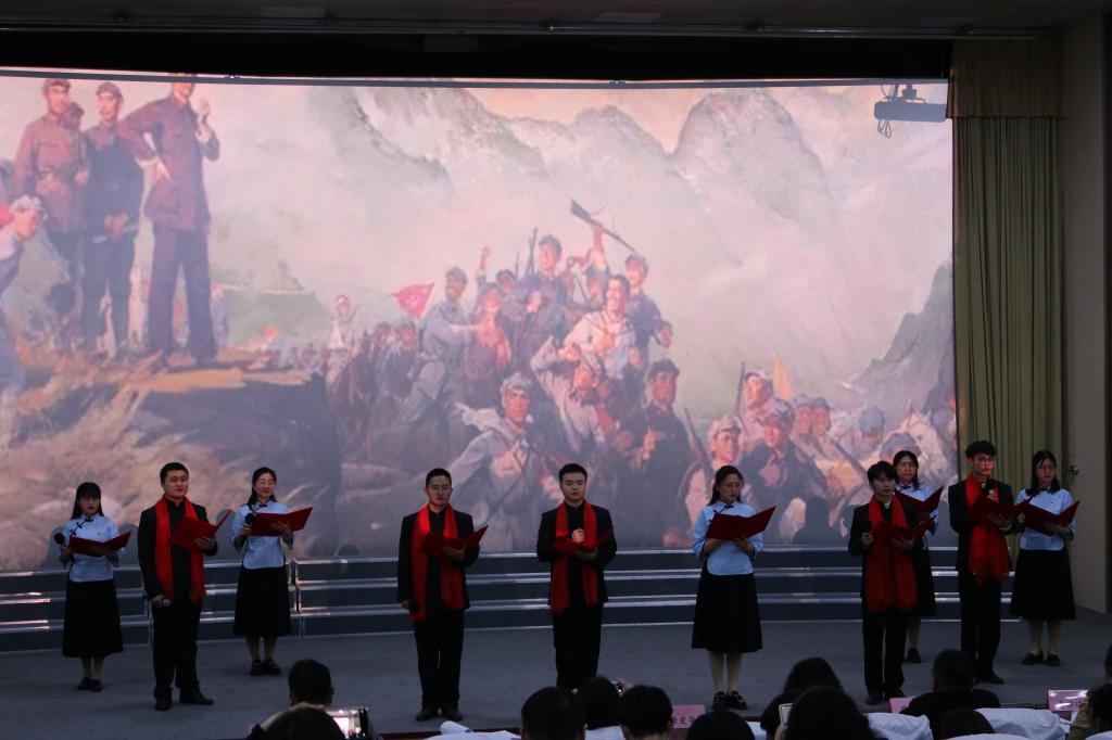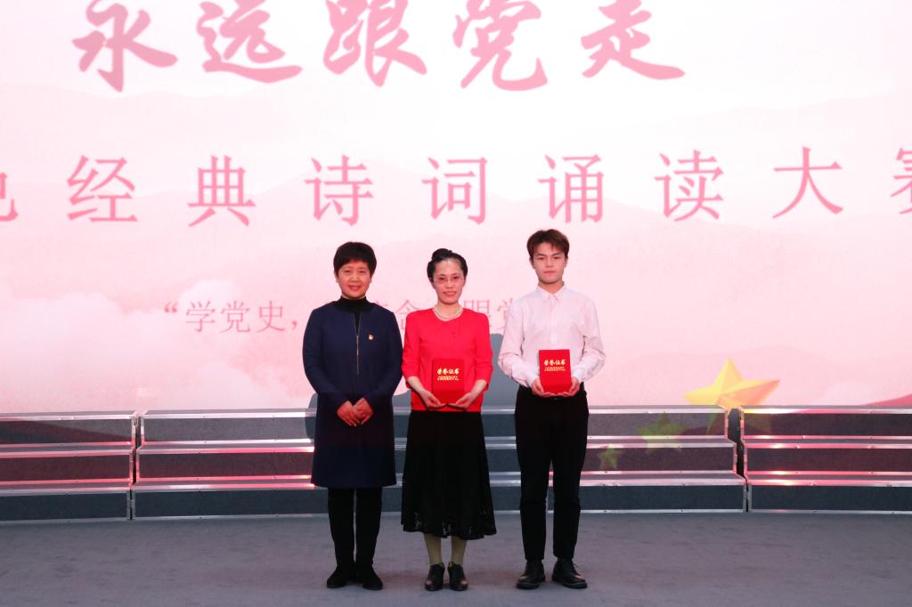 比赛经过各二级学院精心选拔,共有13组选手脱颖而出进入决赛,选手们用嘹亮的诵读声表达了对国家的热爱,对党的忠诚。声情并茂的《美丽中国》、《党旗飘飘》,感人肺腑的《永远跟党走》、《七月的天空》,铿锵有力慷慨激昂的《可爱的中国》、《党旗颂》、《号角者》等等,一篇篇经典作品伴随着悠扬婉转的音乐被选手们声情并茂、抑扬顿挫的吟诵着,一字一句间诉说着党的百年岁月,诉说着共产党人对革命的坚定和对生死的无畏,对建设美丽中国的期待和奋斗。一字一句间讲述了中国共产党从嘉兴红船到如今美丽中国的奋进历程,讲述了中国共产党人百年来英勇的战斗、谦虚的品德、不屈的精神。比赛现场气氛活跃,每到朗诵高潮处,掌声不断,在场师生身临其境,感受着百年奋进史中信仰的力量。比赛结束后,蔡若愚对本次比赛给予点评。在肯定活动意义和参赛作品的同时,从专业的角度对于朗诵时的普通话发音、语言文字、朗诵气息等方面进行了综合分析。最后他借用毛主席诗词“数风流人物,还看今朝”,勉励师生在经典诵读之路上昂首阔步向前行。