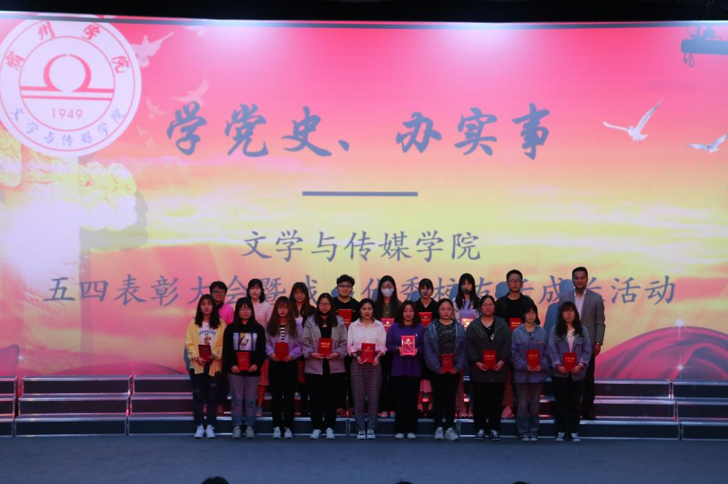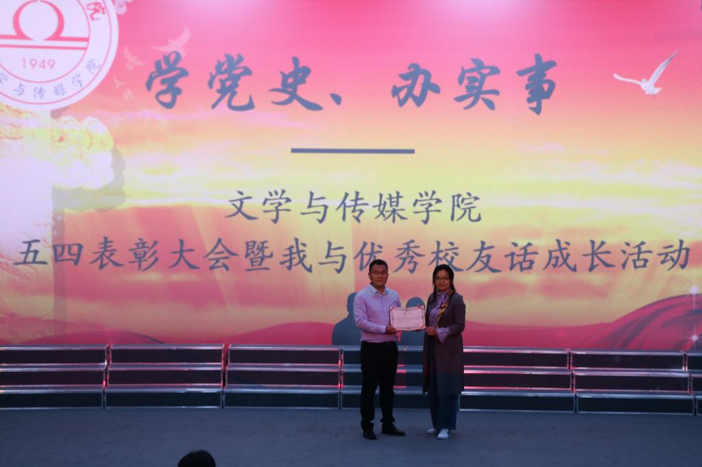 首先进行的是五四表彰大会环节,受表彰的同学们依次上台领奖,本次表彰的项目主要包括文学与传媒学院2021年寒假职场人物访谈优秀个人、2021年寒假读书活动优秀个人、志愿服务优秀个人、社会实践先进个人以及专业实践优秀个人。