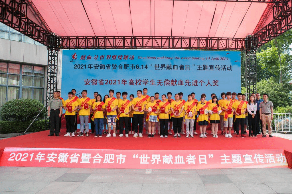 为庆祝第18个“世界献血者日”,2021年6月11号,安徽省暨合肥市6.14“世界献血者日”主题宣传活动在合肥市顺利召开。此次活动由安徽省卫生健康委员会、安徽省红十字会、中共安徽省直属机关工作委员会、中共安徽省教育工作委员会、安徽省人民政府国有资产监督管理委员会、中国共产党青年团安徽委员会、等单位联合开展。本次活动表彰了公益之星、先进集体和高校先进学生个人,文传学院18新闻班梦雪同学荣获安徽省2021年高校学生无偿献血先进个人奖。