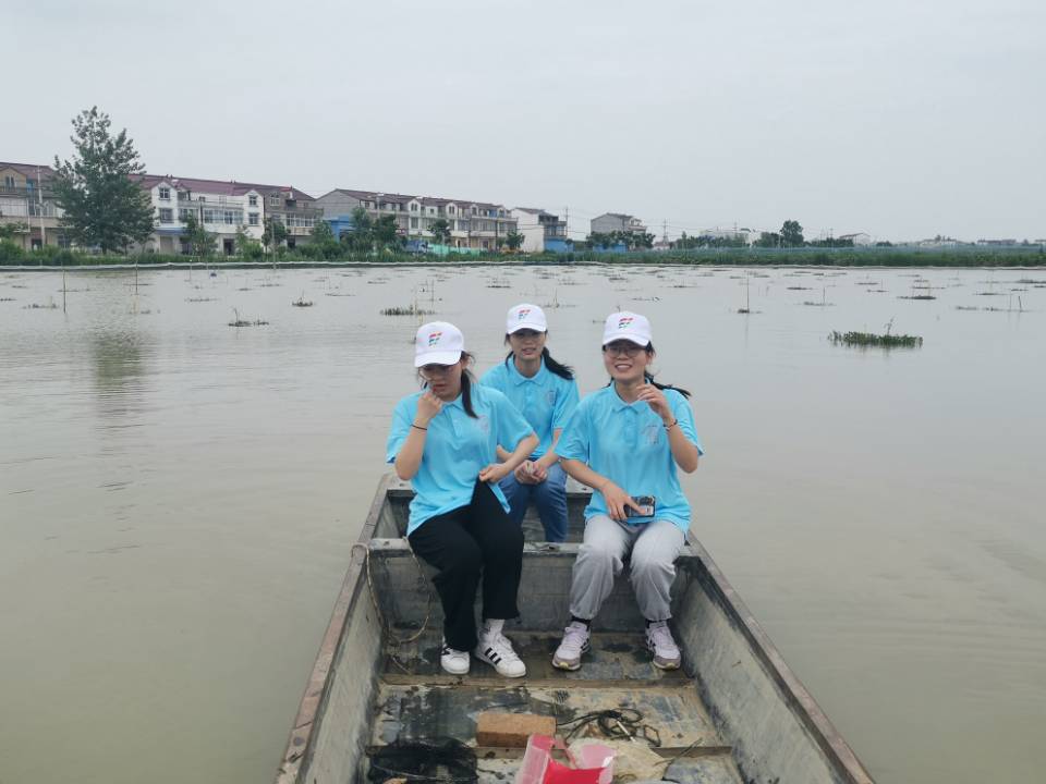 在徐书记和民兵营长魏俊及当地村民的带领下,实践团队来到了泗县龙辉水产养殖专业合作社,了解当地稻虾(藕蟹)套养技术。实践团队到达时,当地村民正在为水塘清淤补氧。稻虾养殖是一项在项沟村村委会的领导下通过合作社的方式养殖高效经济水产,从而带领贫困户脱贫,促进农村经济发展的有效脱贫措施。实践团队后又上船体验,其间养殖者还为队员们示范如何捕捞水中的虾,蟹等水产物。
