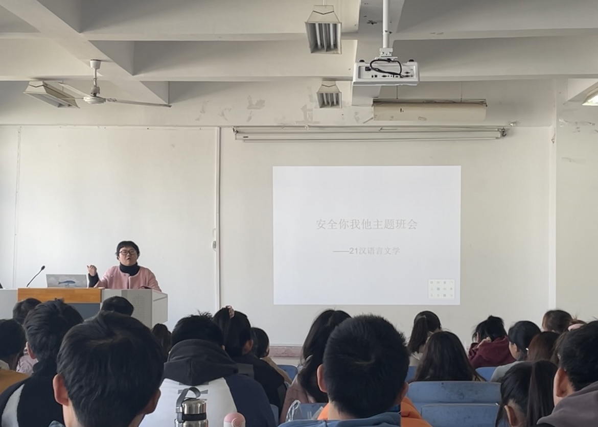 为了进一步提高同学们的安全意识,达到积极预防发生并提高学生基本自我保护的能力,文学与传媒学院21级汉语言文学班于11月12日在教学楼B301开展了以“安全你我他”为主题的班会,对学生进行安全教育,全体同学参加了这次班会。