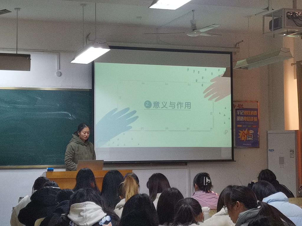 心理委员郭安静向大家介绍了心理健康教育的历史背景以及相应的心理咨询和教育的机构。会议中,她强调大学生的心理健康教育问题是不容忽视的,又详细的给大家讲解了心理健康的意义与作用。