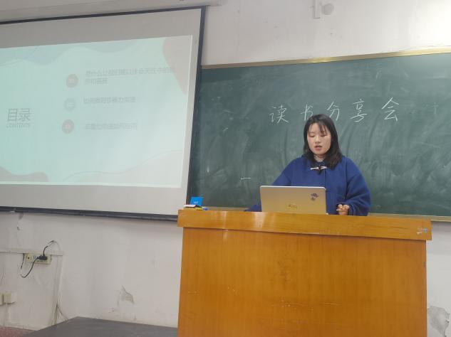 活动的主要环节是推选阅读者上讲台为大家分享自己的阅读书籍,同学们准备充分,制作了精美的ppt并且提前演练,规划演讲措辞,表达自己对手中所捧之书独特的见解和推荐的理由。刘满对《傲慢与偏见》进行了一番全新的解读,盛子慧同学分享了《非暴力沟通》,提出暴力沟通的危害,呼吁同学们理解并使用非暴力沟通。阅读范围宽泛,还有神话《山海经》、儿童文学《天蓝色的彼岸》等等。为进一步起到锻炼效果,全程采用录像的方式记录同学们的演讲,可以对照视频查漏补缺。