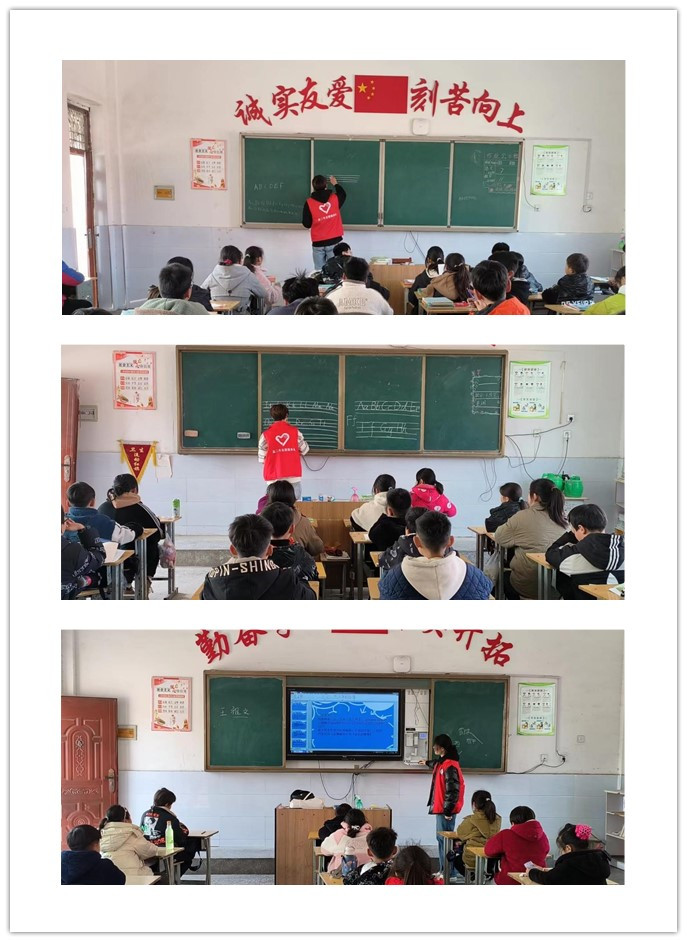本次活动前期志愿者们认真备课,充分准备,每两名志愿者负责一个年级的教学活动。基于不同年龄段的学生汲取并消化知识的能力和学习内容不同,志愿队在一二年级开展音乐及美术课程,在三至六年级开设英语课程的安排。此方法既能够培养协作能力,达到“一加一大于二”的效果,又能更好地维持班级秩序,在志愿者们耐心的“教”和小学生们愉悦的“学”完美配合下,小学生们受益匪浅,志愿者们也收获了全然不同的人生体验和专业实践锻炼。