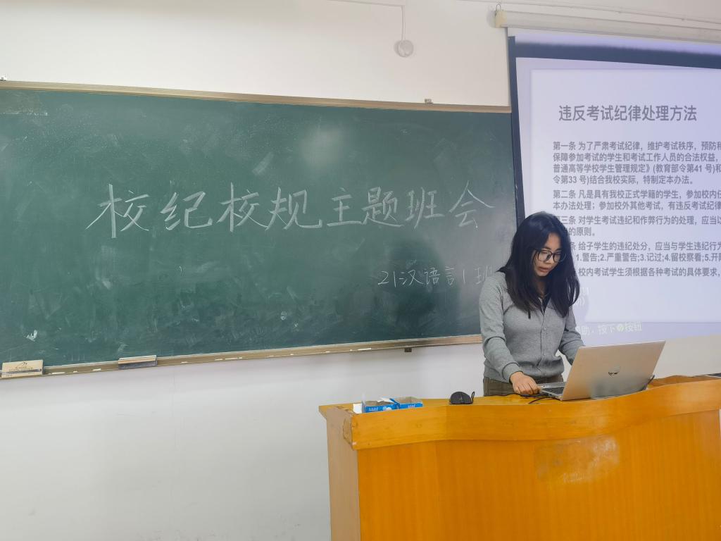 以各个班级为单位,各班辅导员组织开展校纪校规学习教育主题班会,并做动员讲话,强调班委要起好带头示范作用,率先学习并消化最新版《学生手册》内容;积极向班级同学宣传《学生手册》的有关精神。