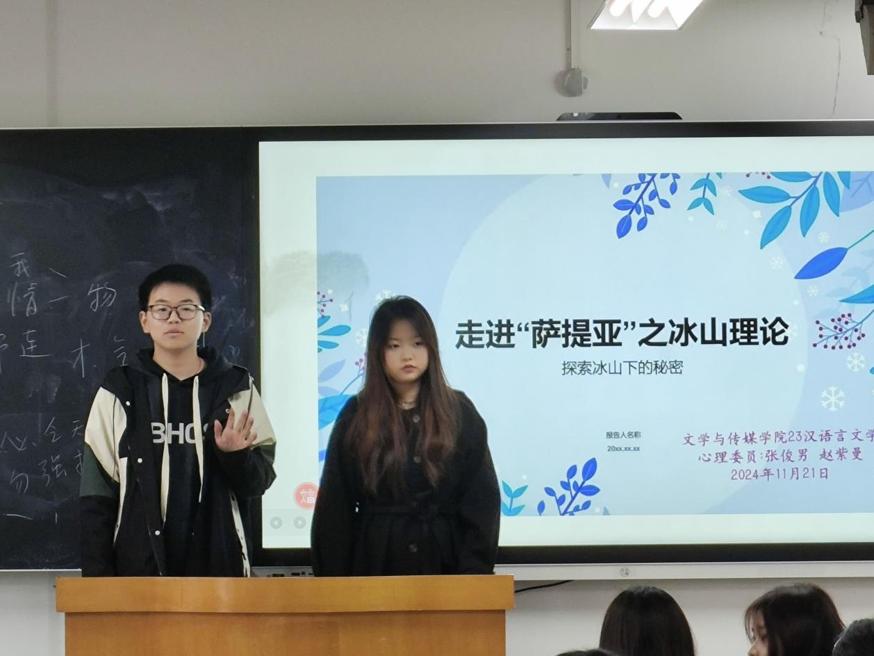 11月10日,23汉语言文学班在教A412组织一场主题为“走进‘萨提亚’之冰山理论”的心理主题班会。此次班会旨在深入探讨萨提亚模式中的冰山理论,帮助同学们更好地理解个体内心世界的复杂性。
