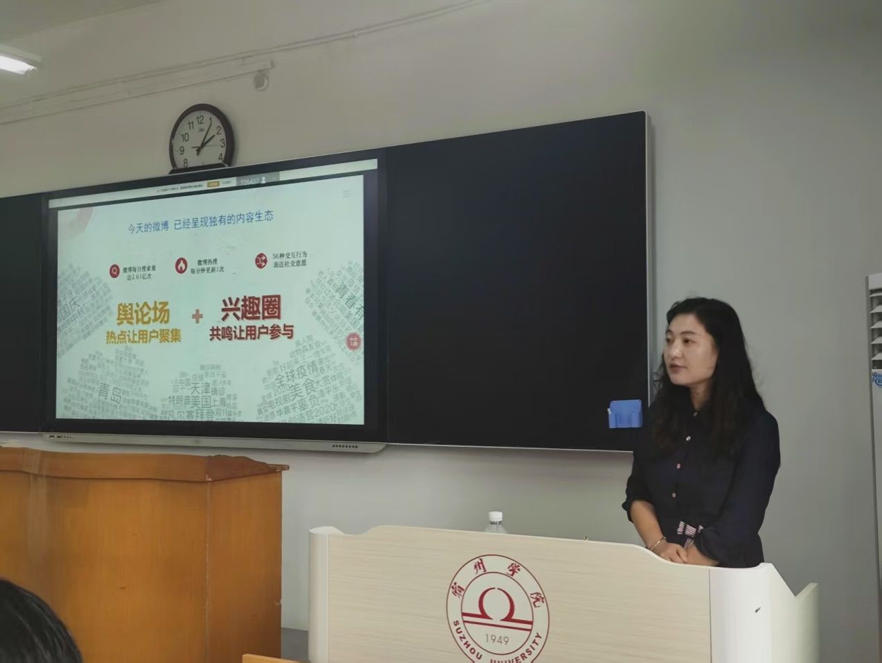 在互动讨论环节,郭远远与同学们热烈探讨交流。围绕同学们感兴趣的微博运营实操,郭远远就微博同城热搜上榜规范、微博内容发布时间与频率、微博编辑技巧等实用知识进行了详细解释。同学们纷纷表示,此次讲座内容丰富、干货满满,既加深了对媒介融合理论的理解,也学习到诸多实用的行业经验,有助于厘清专业学习与职业发展的方向。