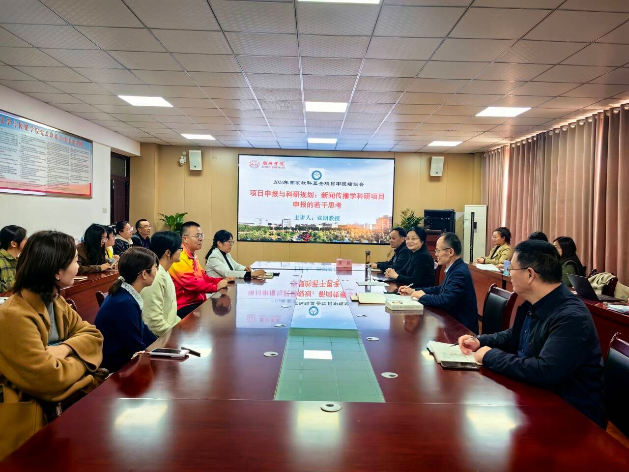 10月22日下午,为推动2026年度国家社科基金项目申报工作,文学与传媒学院邀请安徽大学张朋教授举办“项目申报与科研规划:新闻传播学科研项目申报的若干思考”学术讲座,讲座由文传学院党委副书记、院长李月云主持,全体教师参加。