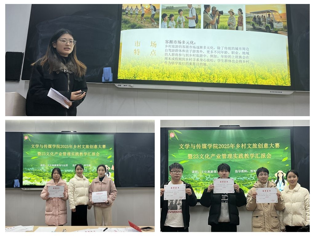 本次比赛依托邢雪娥老师的《文化旅游策划与运营》课程,是本学期赴埇桥区镇头村开展实践教学成果的一次集中展示,通过实践调研与创意比拼的结合,不仅检验了文化产业管理专业学生的专业学习成果,更让青年学子在参与乡村文旅策划的过程中,增强了服务乡村振兴的责任意识与实践能力。