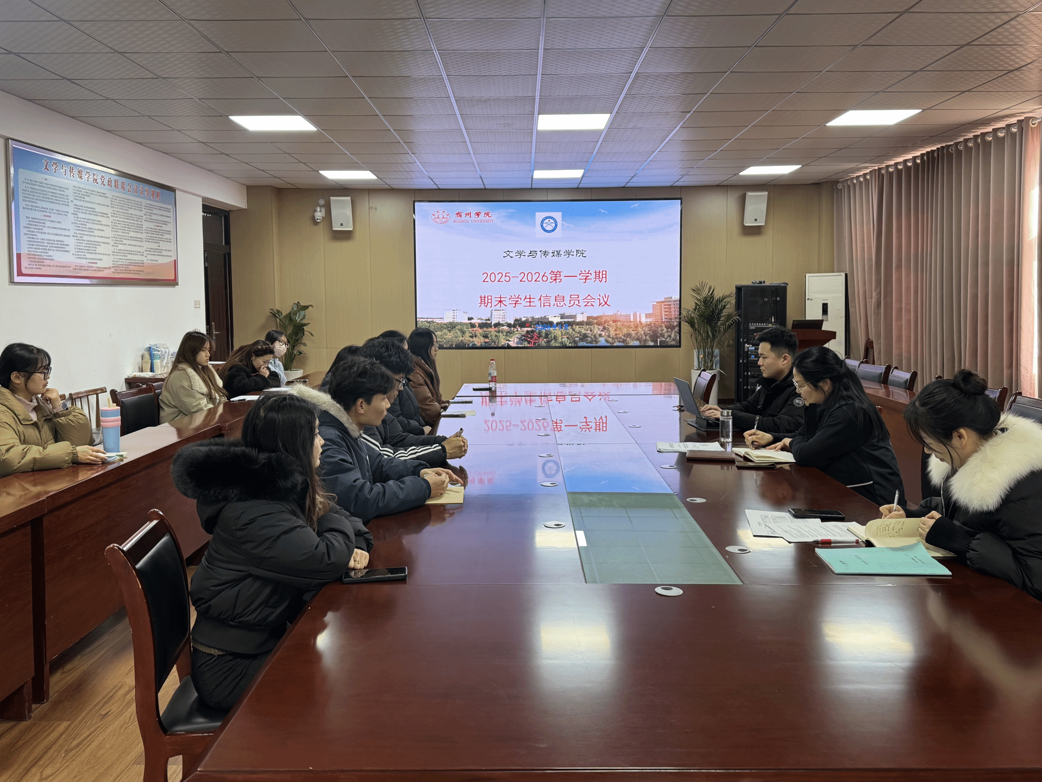 1月7日,文传学院于教A303会议室召开2025—2026学年第一学期期末教学信息员会议。院长李月云、教学秘书周婷、教务员韩博睿及全体教学信息员与会。