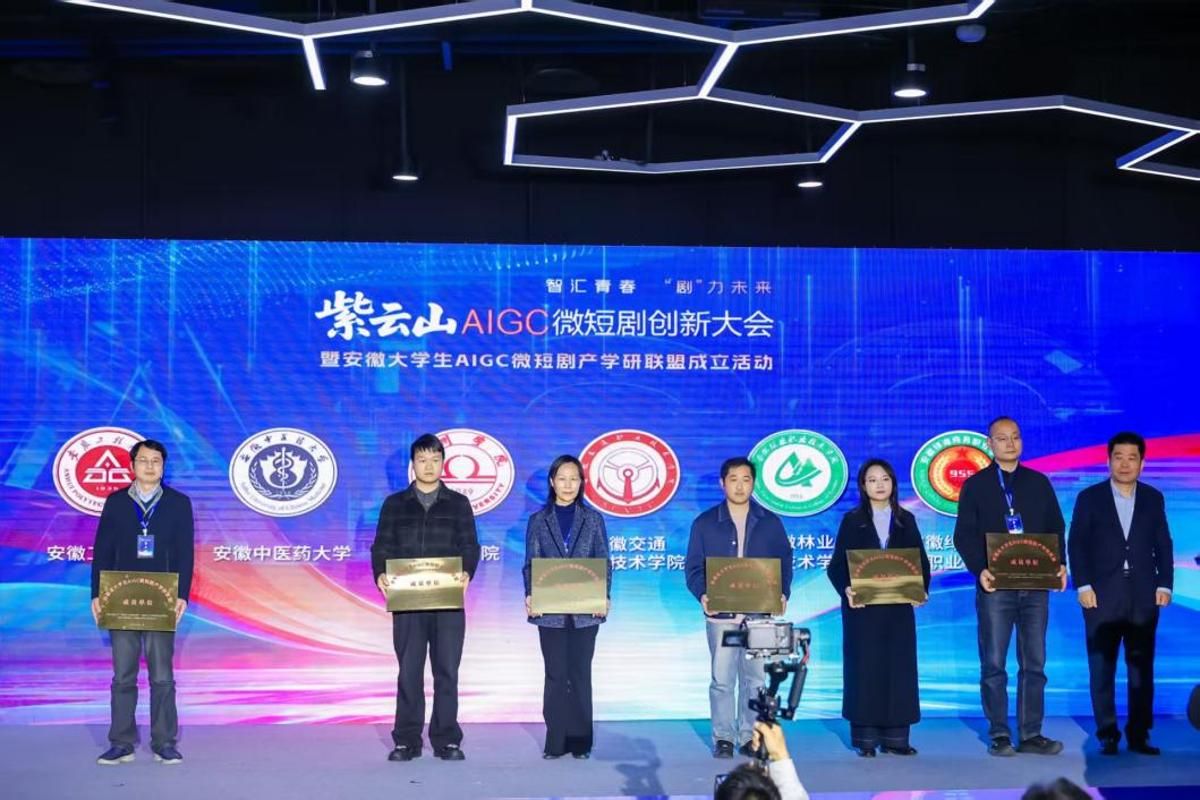 会上,主办单位领导为首批加入安徽省大学生AIGC产学研联盟的30所高校授牌,我校作为联盟成员单位之一参加授牌仪式。现场同步发布了联盟运营模式,推出“安徽五大文化””和“安徽成语故事”微短剧共创计划。在战略签约环节,省教育厅、省人社厅与安徽广播电视台、紫云山文创园签约共建安徽大学生AIGC实训基地和“影视OPC社区”,搭建人才培养、实践实训、就业对接一体化平台。