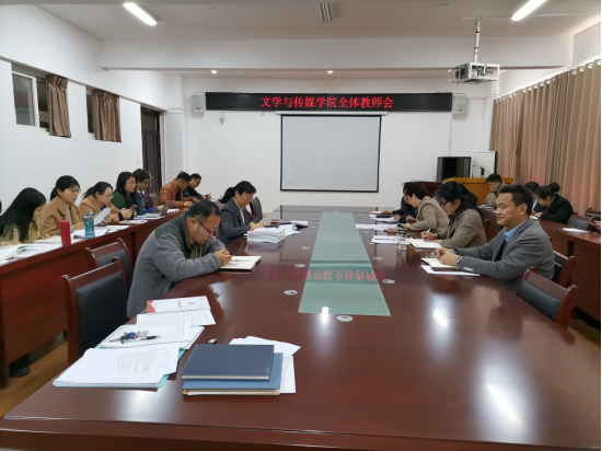 3月24日下午1:30,文学与传媒学院在教A303召开全体教师教学工作会议,院长蒋宗霞、党委书记李月云、副书记王绍卫、副院长张德岁及全体教师参会。会议由蒋宗霞主持。