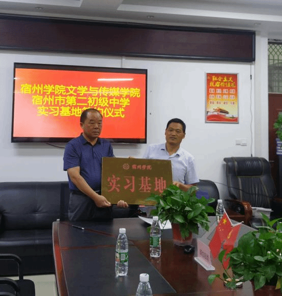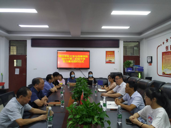 9月14日上午,文学与传媒学院院长张德岁、副院长满建、研究员单冬冬等前往宿州市第二初级中学签订实习协议,受到宿州市第二初级中学校长李玉玲,副校长王志强、路美峰,教研室主任杜庆云、实习责任老师李峰等一行热情接待。
